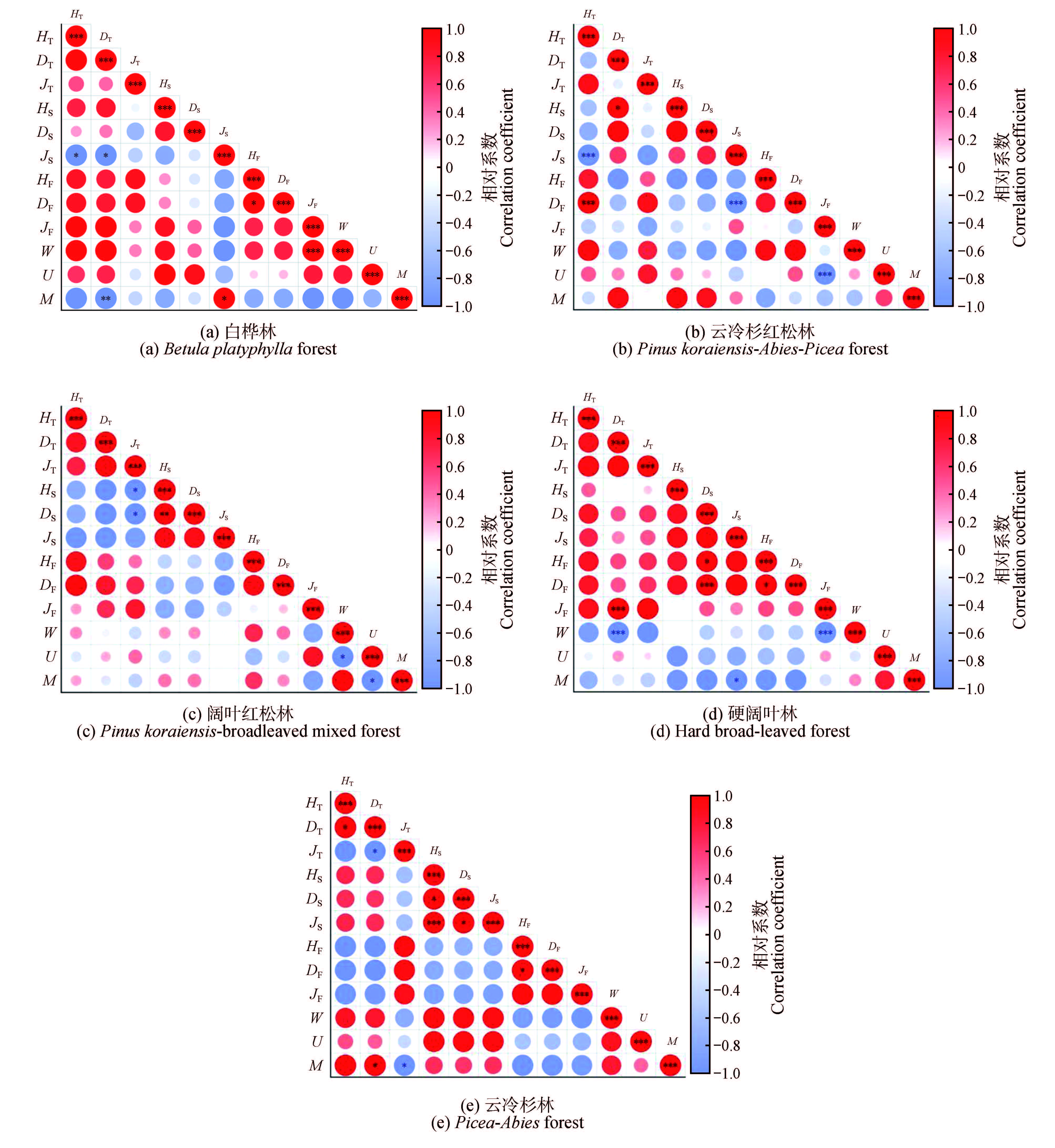 以黑龙江朗乡国家级自然保护区白桦林、云冷杉红松林、阔叶红松林、硬阔叶林和云冷杉林5种林型为研究对象,基于5块固定样地的实测数据,研究5种林分中植物多样性与林分空间结构的关系。以角尺度、大小比数和混交度3个指标来描述林分空间结构,以Simpson优势度指数、Shannon-Wiener多样性指数和Pielou均匀度指数3个指标来描述植物多样性,利用相关性分析探究不同林分空间结构对植物多样性的影响,找出影响植物多样性的主要林分空间结构因子。结果表明,5种林分间角尺度和大小比数无明显差异,云冷杉红松林和硬阔叶林混交度存在显著差异(P<0.05),但5种林分均形成混交、聚集且具有一定竞争力的生长状态。各林分木本植物物种组成丰富,阔叶红松林乔木层Shannon-Wiener指数、Simpson指数和Pielou指数均最高,云冷杉林灌木层Shannon-Wiener指数最高。白桦林乔木层Shannon-Wiener指数和Simpson指数与灌木层Pielou指数呈显著负相关,云冷杉红松林中乔木层Shannon-Wiener指数与草本层Simpson指数呈极显著正相关,阔叶红松林中乔木层Pielou指数与灌木层Shannon-Wiener指数呈显著负相关,硬阔叶林乔木层Simpson指数与草本层Pielou指数呈极显著正相关,云冷杉林灌木层Shannon-Wiener与Pielou指数呈极显著正相关。不同的林分空间结构指标对植物多样性的影响不同,其中最主要的影响因子是混交度,混交度越高,多样性越丰富。研究结果对保护区的生物多样性保护提供指导意见。