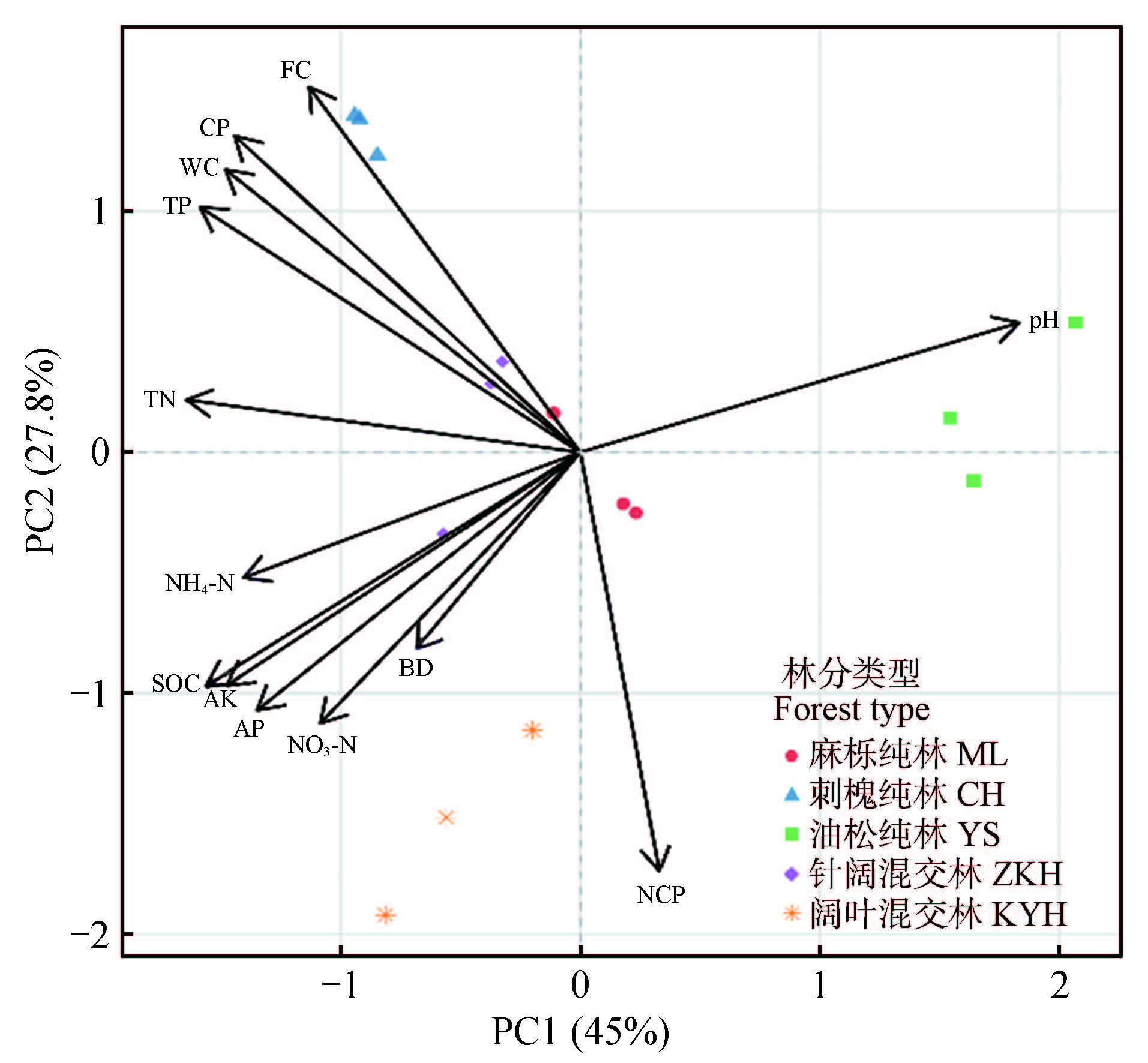 探究黄河下游鲁中南丘陵地区不同人工林林型(纯林与混交林)对土壤水文特性与养分状况的影响,为该区域水土保持林优化配置提供科学依据。选取麻栎纯林、刺槐纯林、油松纯林、阔叶混交林(麻栎×刺槐)和针阔混交林(油松×刺槐)5种典型林型,通过野外采样与室内分析,系统测定土壤容重、孔隙度、持水量、pH、有机碳以及氮、磷、钾等指标。结果表明,刺槐纯林表现出最优的土壤持水能力(田间持水量为52.6%)和较高的孔隙度,但通气性较差;油松纯林透气性与持水能力均弱于其他林型;混交林在土壤透气性和持水能力这2方面表现较为均衡,尤其针阔混交林田间持水量接近刺槐纯林。养分方面,阔叶混交林在有机碳(27.58 g·kg⁻¹)、全氮(4.76 g·kg⁻¹)及速效养分质量分数上显著优于纯林。相较于纯林,混交林(尤其是阔叶混交林)在“持水-通气平衡”和“养分供应”等土壤功能上更具优势,建议在该地区生态修复中优先采用混交造林模式,以实现水土保持与土壤肥力提升的双重目标。