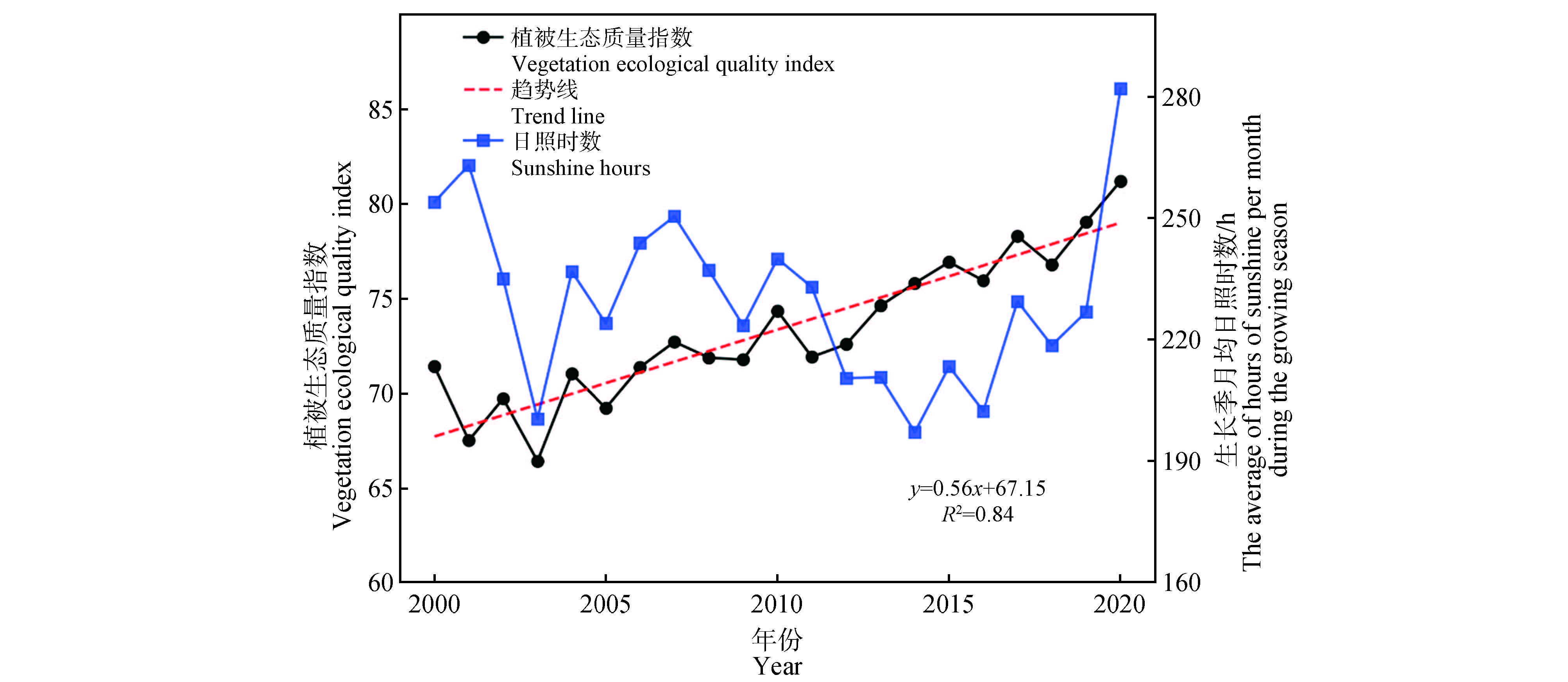 植被生态质量是表征陆地植被景观的一个基本要素,其变化对全球和区域生态系统的能量流动和物质循环具有深刻的影响。为此,以黑龙江省为研究区域,基于Landsat系列数据、气象数据和土地利用类型数据分别估算植被覆盖度(fractional vegetation cover,FVC)和净初级生产力(net primary productivity,NPP),从而构建植被生态质量指数(vegetation ecological quality index,VEQI),分析2000—2020年植被生态质量指数的时间变化特征,运用最优参数地理探测器探究地形因子、土壤因子、气象因子和人为活动因子对植被生态质量指数空间分异的驱动机制。结果表明,2000—2020年,黑龙江省年均植被生态质量指数呈显著上升趋势(年均增长0.56);4个因子均能够有效解释植被生态质量指数的空间分异。其中,土壤容重、生长季月均温度、土壤酸碱度和高程是黑龙江省植被生态质量指数空间分异的主要影响因子,人口密度和坡向的协同作用对植被生态质量指数的空间分异有着强烈的非线性影响。
