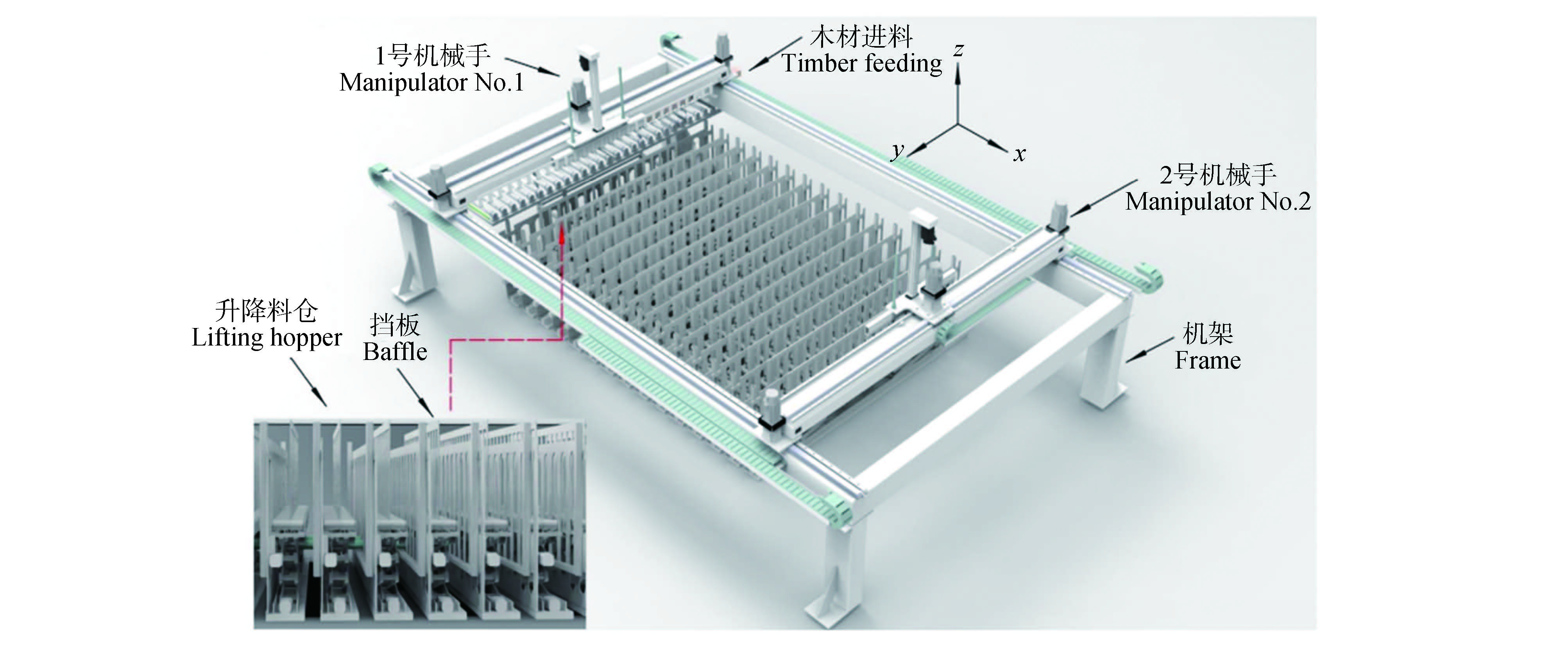 为提高定制化门窗材分类堆垛效率,对双梁堆垛机的机构轨迹运动特征进行设计与分析。针对双梁堆垛机在堆垛过程中产生的运动轨迹动态干涉问题,提出以相对位置最优可行度进行判别分析的方法,在此基础上对不同的运动特性制定不同的运动策略,构建双梁堆垛机的协同规划模型,通过标准化运动学建模剖析轨迹运动特性,完成可行度规划模型优化联合机械系统动力学自动分析软件(Automatic dynamic analysis of mechanical systems,ADAMS)与Matlab Simulink建立运动学模型,对机械手的规划模型进行仿真验证。以ADAMS与Matlab Simulink的系统仿真技术对运动模型的解集进行数值分析验证显示,双机械手x轴方向位移轨迹无重叠区域,有效避免干涉碰撞风险;速度曲线连续无突变,加速度集中在2~4 m/s²,证实所建立运动模型的有效性。研究建立的双机械手运动规划模型可以有效地提升门窗材分类堆垛过程的效率,具有很高的可靠性,对于促进定制化门窗材的智能化分类堆垛具有重要意义。
