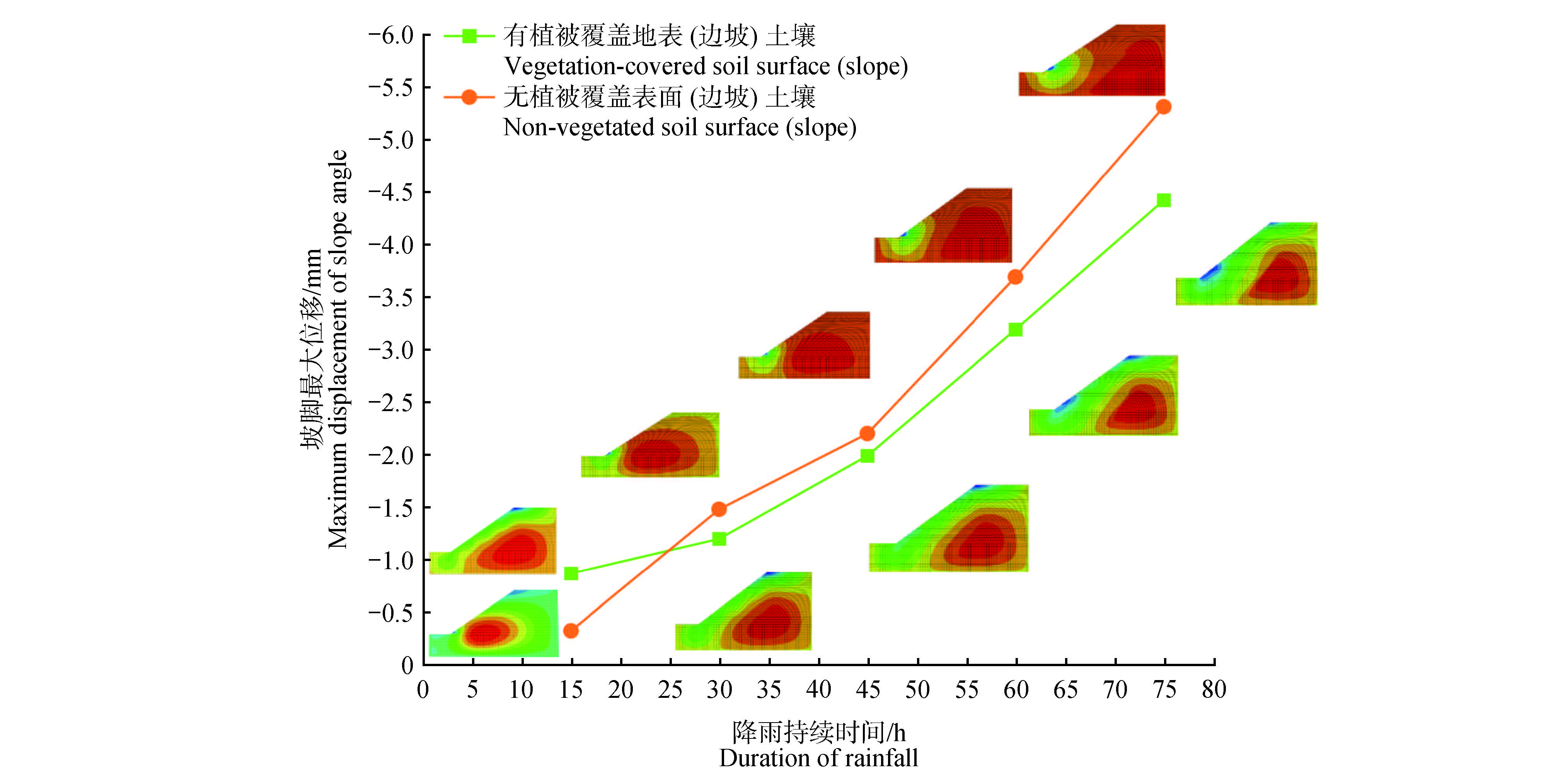 通过数值模拟与宏观试验相结合的方法,探讨植被对边坡冲刷防护的作用机制。首先通过搭建人工试验台,对是否有植被覆盖条件下的边坡进行实际试验,然后利用数值模拟对不同植被条件下的边坡冲刷过程进行仿真。试验结果表明,植被能够有效防护边坡,减缓冲刷速率,且防护效果具有较强的适应性,仿真结果与试验结果的变化规律与趋势具有一致性,验证其数值模拟结果的可靠性。进一步研究表明,不同冲刷时长下植被对边坡稳定性具有重要影响。通过数值模拟以及试验的分析,验证植被通过叶、茎、根的协同作用改善边坡稳定性。植被在边坡冲刷防护中发挥重要作用。