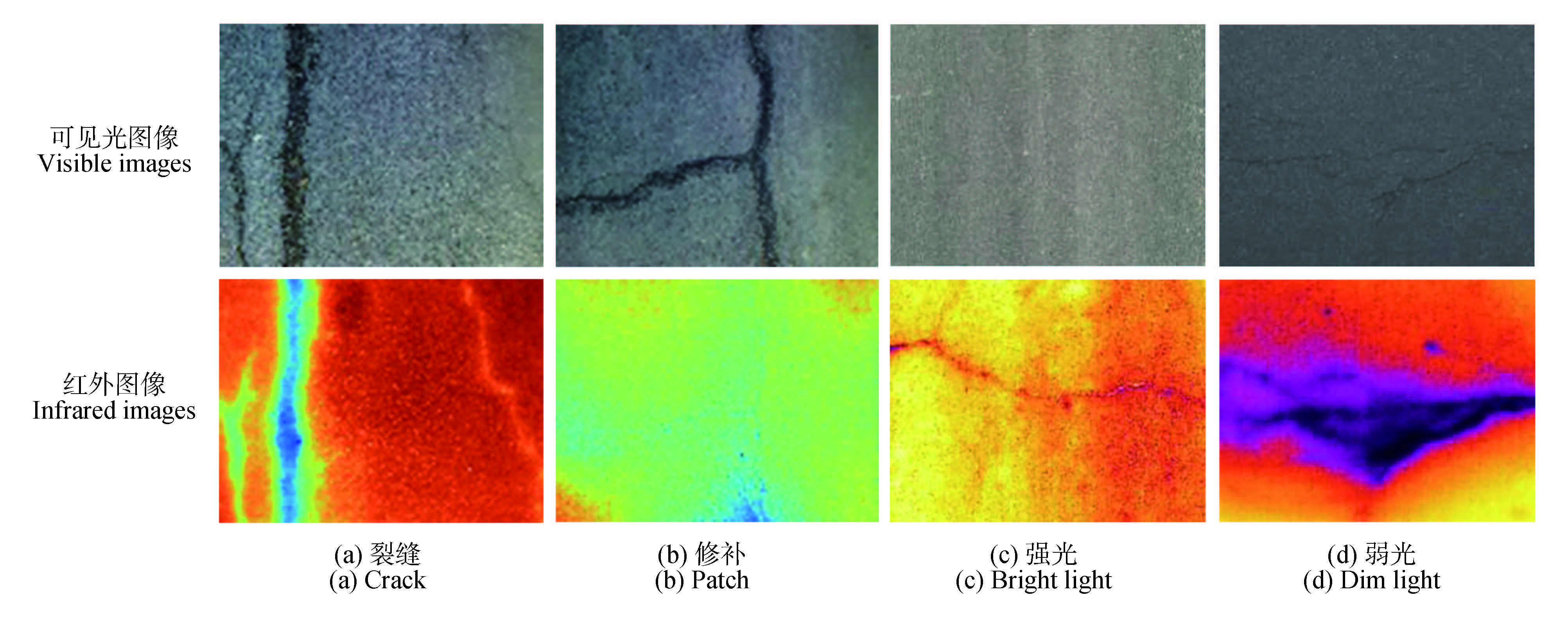 林区道路因其所处的自然环境特点和车载荷载易产生裂缝、坑槽等病害,路况较差且养护成本高。针对病害识别过程中目标检测框不准确、无人机视角下病害尺度变化大以及光照条件不足等问题,提出基于可见光与红外图像中间融合策略的双模态沥青路面病害检测方法(bimodal integrated road detection YOLOv8,BIRD-YOLOv8)。将自适应细粒度通道注意力机制(adaptive fine‑grained channel,FCAttention)和线性可变形卷积(linear deformable convolution,LDConv)串联提出DSFM(DynaSpectra fusion module)模块,替换BIRD-YOLOv8主干网络中的C2f结构,提升病害区域的特征提取能力;引入边界框回归优化方法(normalized Wasserstein distance loss,NWDLoss)替换CIoU,以增强模型对小尺度病害的检测能力。试验结果表明,改进后算法的均值平均精度达到83.3%。其中,横向裂缝、纵向裂缝、网状裂缝和坑槽的平均精度分别达到88%、91.3%、90.5%、63.5%,为林区道路路面病害识别与养护提供重要依据。